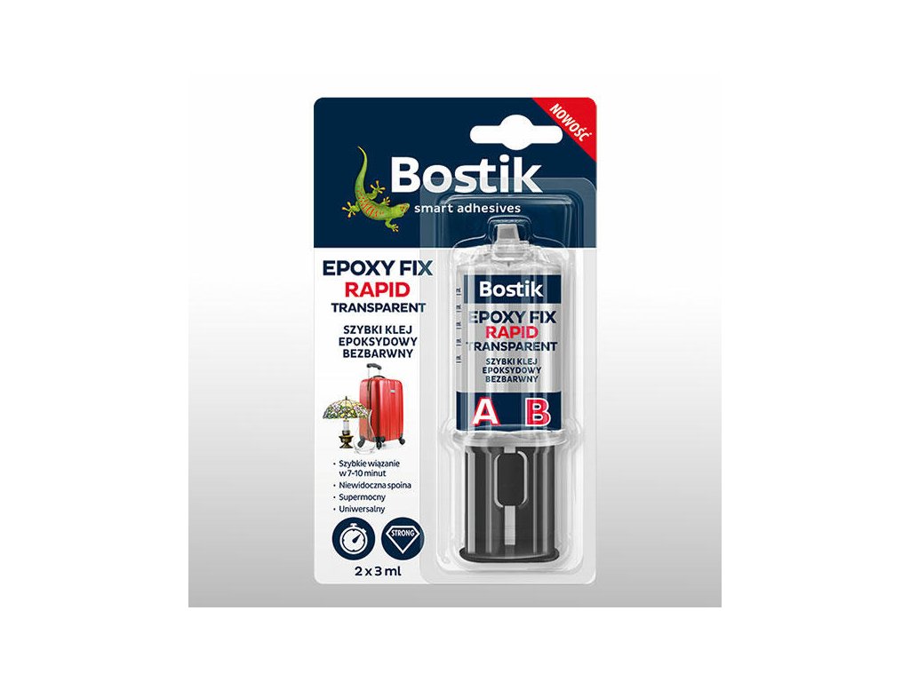 Bezbarvé dvousložkové lepidlo na bázi epoxidové pryskyřice s velmi rychlým vytvrzením během několika minut. Vytvrzený spoj je pružný, mechanicky odolný a odolný vůči měnícím se povětrnostním podmínkám. Dvousložkové epoxidové lepidlo lepí následující materiály: sklo, keramiku, porcelán, beton, plasty, kámen, kov, hliník, gumu, dřevo, cihly, zlato, stříbro, ocel, korek, materiály na bázi dřeva, pěny, polystyren. BOSTIK EPOXY FIX RAPID TRANSPARENT dvousložkové epoxidové lepidlo je také označováno jako tekutý kov. Použití zahrnuje opravy různých materiálů, jako jsou kovy, keramika, dřevo, plasty, a také vyplňování dutin a montáž vysoce pevných součástí vyžadujících rychlé a trvanlivé spojení.