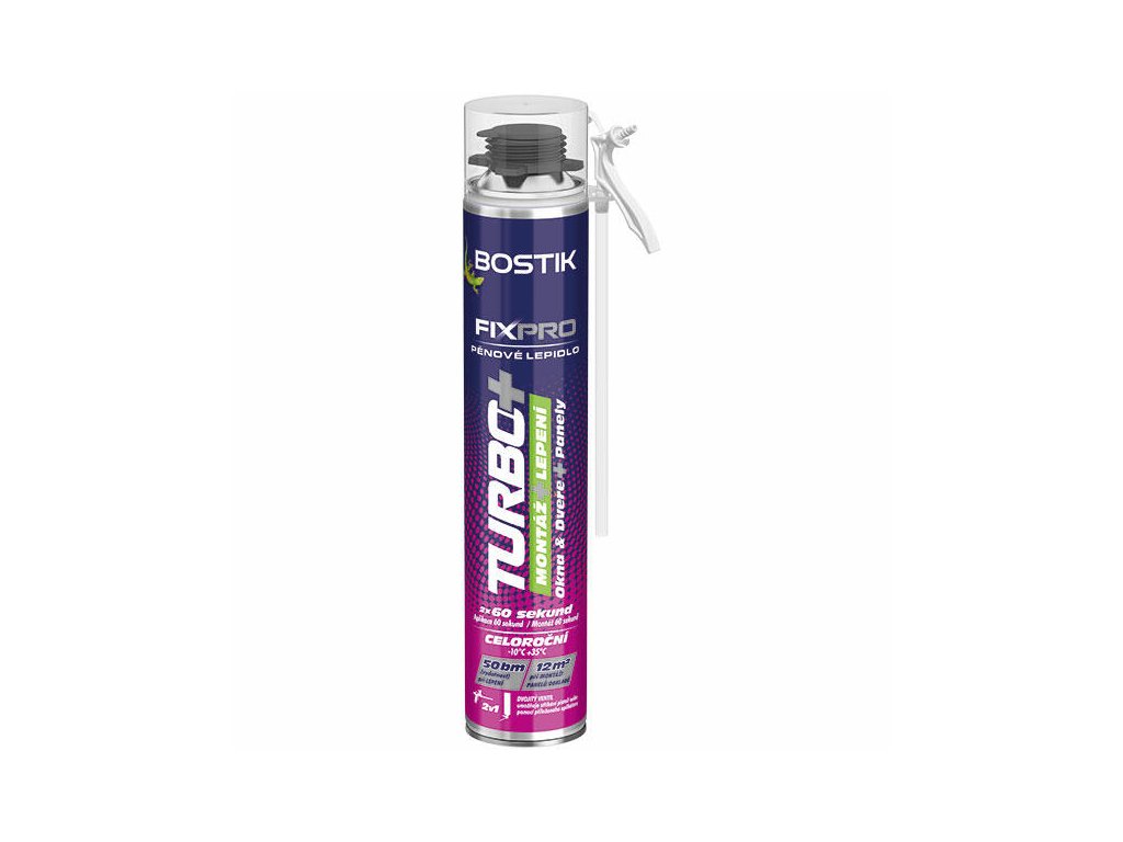 Bostik FIXPRO Turbo+ je rychle tuhnoucí a pevné lepidlo na bázi polyuretanové pěny. Je vhodné pro montáž okenních a dveřních rámů, lepení obkladů, panelů, dekorativních prvků a vyplňování dutin. Je rychlý, ale ne příliš rychlý: 60 sekund na nanesení pěny a 60 sekund na vytvrzení (dosažení silné počáteční přilnavosti). Jeho celoroční aplikace je vhodná pro teploty od -10 °C do +35 °C.