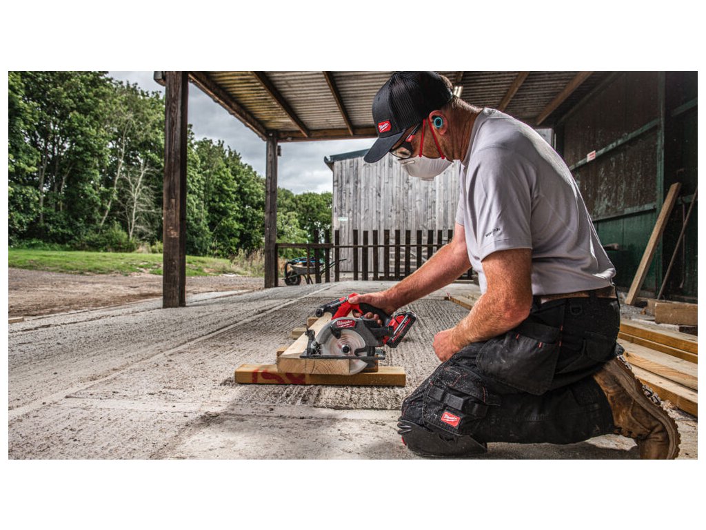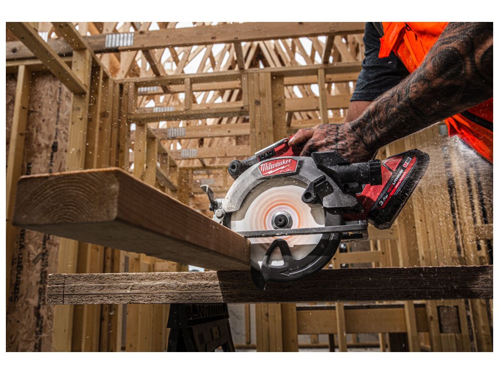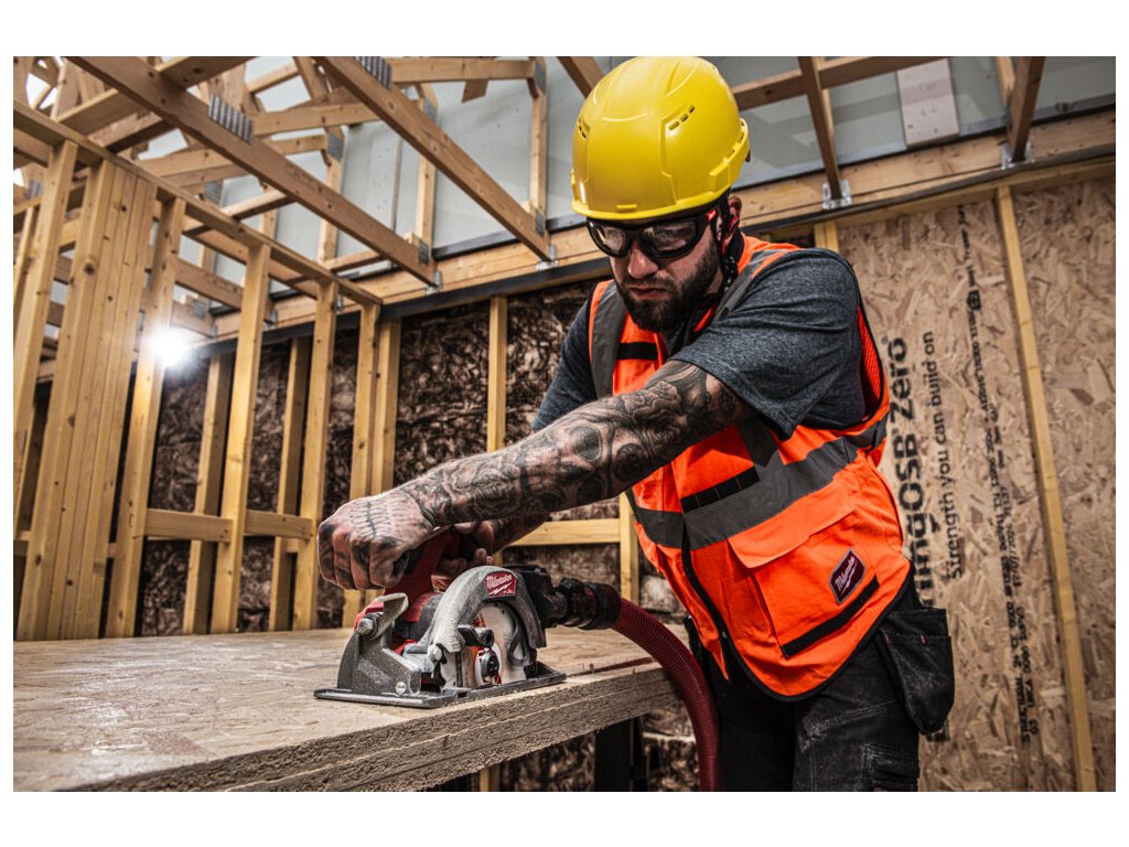 - 165 mm pilový kotouč s hloubkou řezu 57 mm, který umožňuje proříznout hromadu desek OSB 3x 18 mm.