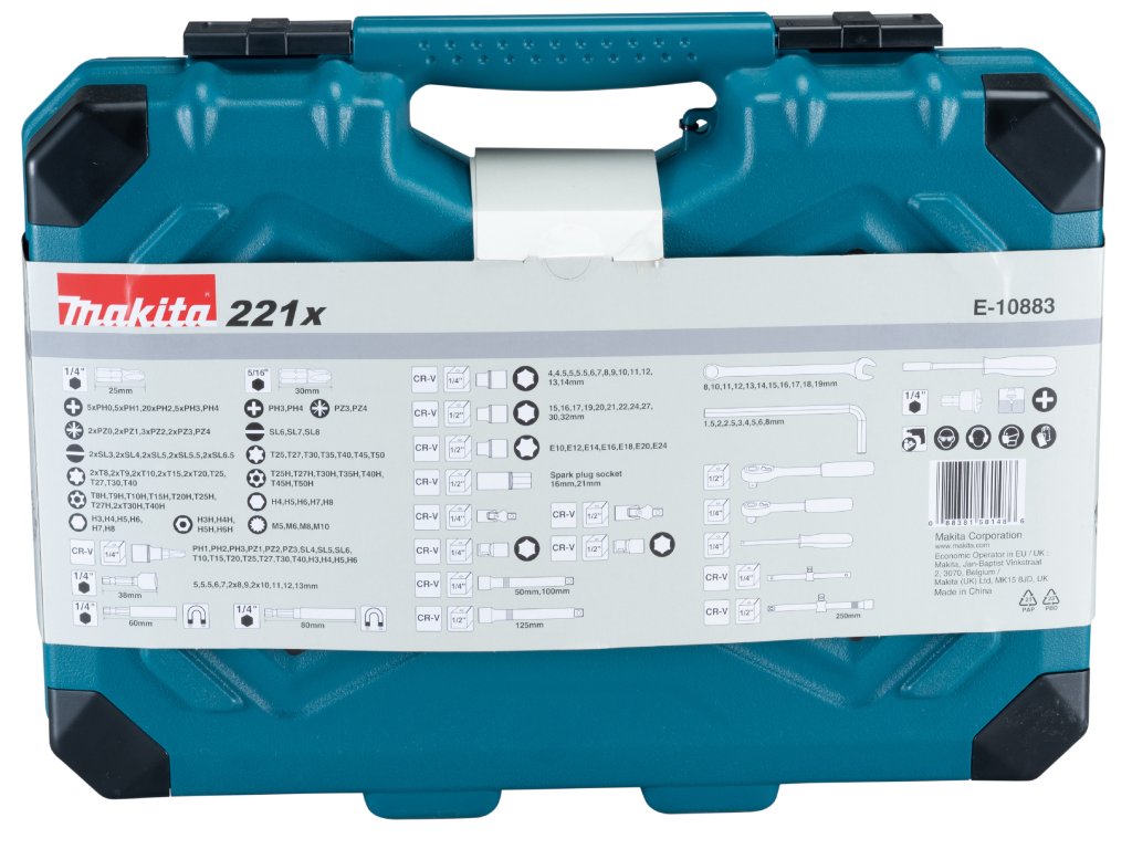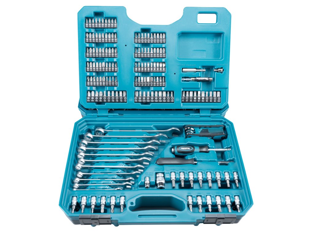 Sada obsahuje . 12 ks kombinovaných klíčů 8-19mm 8 dílná sada inbusů 1 ks šroubováku s magnetickou špičkou 1 ks ráčna 1/4" 1 ks ráčna 1/2" 10 ks nástrčných klíčů 1/4", 5-13 mm vnější šestihran 13 ks nástrčných klíčů 1/4", 4-14 mm vnější šestihran 5 ks nástrčných klíčů 1/4", 4-8 mm vnější torx 11 ks nástrčných klíčů 1/2", 15-32 mm vnější šestihran 3 ks nástrčných klíčů 1/2", 20-24 mm vnější torx 6 ks nástrčných klíčů 3/8", 10-18 mm vnější torx 2 ks klíče na svíčky 16 mm / 21 mm 2 ks prodloužení čtyřhran 1/2" 2 ks prodloužení čtyřhran 1/4" 30 ks bitů šestihran 1/4",25 mm v krabičce 80 ks bitů šestihran 1/4",25 mm 29 ks bitů šestihran 1/4",30 mm 1 ks magnetický držák 60 mm 1 ks magnetický držák 80 mm 1 ks nastavitelný magnetický držák 120 mm 1 ks rukojeť čtyřhran 1/4" 1 ks adaptér čtyřhran 1/4" na šestihran 1/4" 1 ks adaptér čtyřhran 1/2" na čtyřhran 3/8" 1 ks adaptér čtyřhran 1/2" na šestihran 5/16" 1 ks kloub 1/4" 1 ks kloub 1/2" 1 ks křížová rukojeť 1/4" 2 ks klíče na kufr Rozměry kufru : 470 x 100 x 400 mm Hmotnost : 9,6 kg