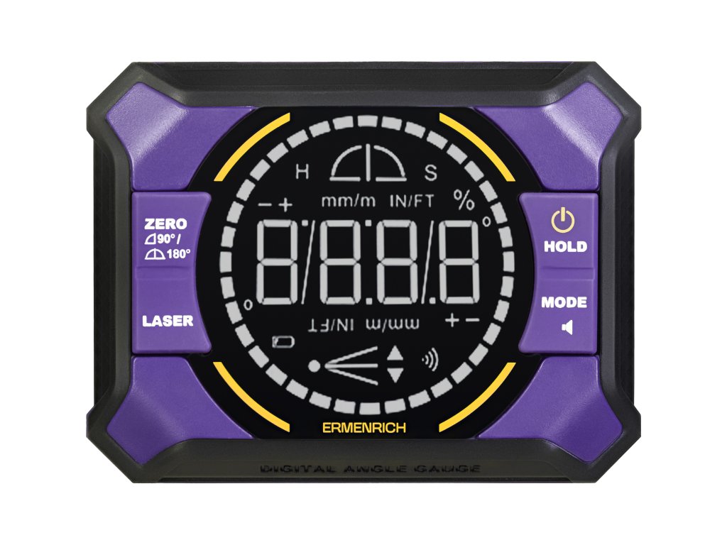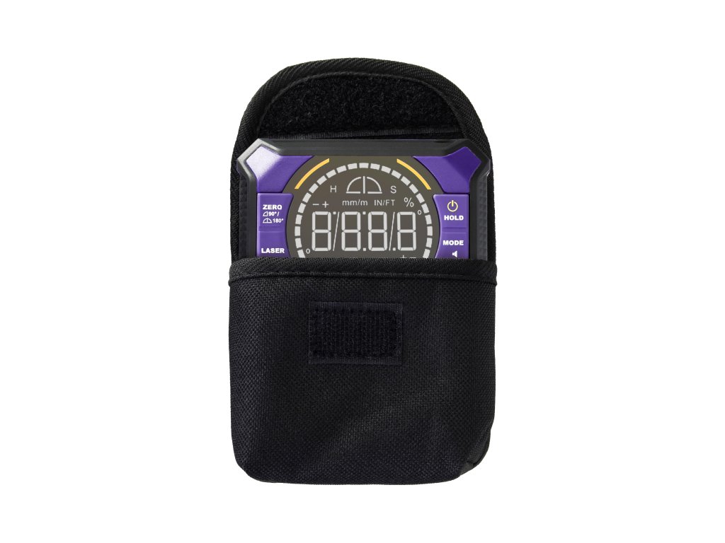 Vestavěný červený laser vytváří dvě vzájemně kolmé čáry, které okamžitě vytvářejí referenční osy bez nutnosti použití dalších nástrojů. Elektronická indikace polohy „bubliny“ zůstává jasně čitelná i za slabého osvětlení. Tlačítko Hold (Podržet) přidrží na displeji průběžné naměřené hodnoty, což usnadňuje přepravu přístroje. Tlačítko Zero (Nula) umožňuje nastavit nový referenční bod pro sérii opakovaných nebo symetrických měření. Přístroj vás upozorní zvukovým signálem, když je dosaženo cílového úhlu, což je užitečné zejména v případě, když displej není viditelný.