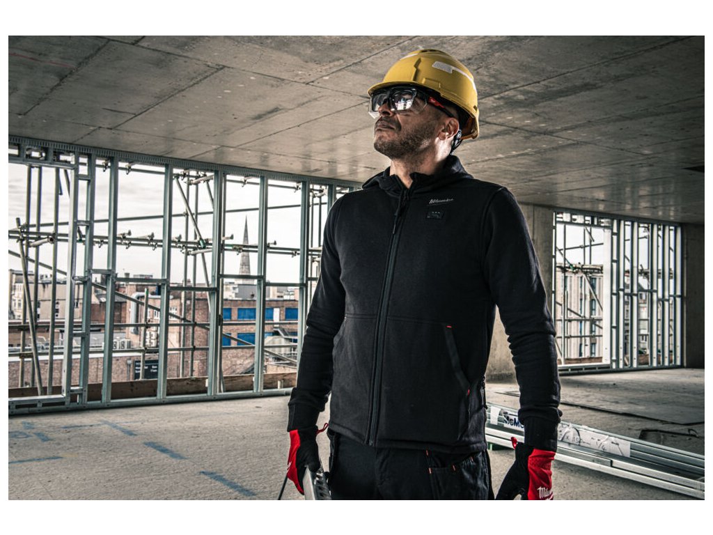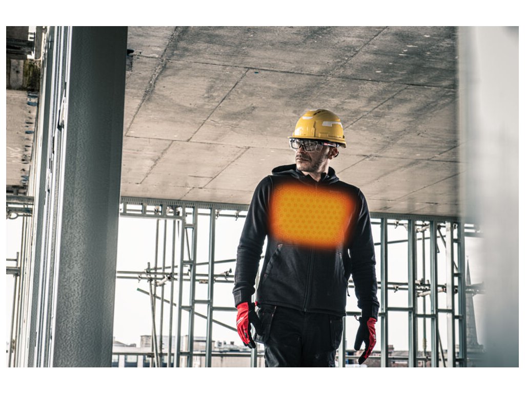 - Odolná vyhřívaná mikina s kapucí z pevné bavlny (56 %) s vyztuženými užitkovými kapsami a vnitřní hřejivou fleecovou podšívkou z polyesteru (44 %) – navržená tak, aby obstála i v náročných venkovních podmínkách